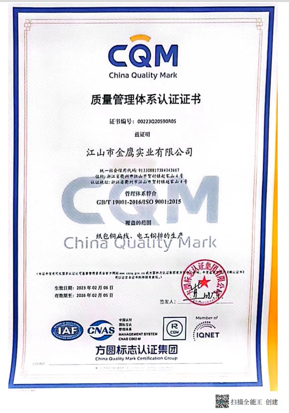 江山市金鷹實業(yè)有限公司,地處江山市賀村工業(yè)園區(qū)趙家山4-1號,占地面積18000M2,建筑面積約15000 M2。原主要生產(chǎn)、銷售“金鷹、金盾、JYD”系列地彈簧產(chǎn)品,是國內(nèi)唯一二次參與制訂地彈簧國家標準的專業(yè)生產(chǎn)廠。企業(yè)曾榮獲“省級先進企業(yè)、文明單位”等殊榮。所生產(chǎn)的系列地彈簧產(chǎn)品,被國家及省有關(guān)部門評定為“省優(yōu)產(chǎn)品、質(zhì)量信得過放心產(chǎn)品、高標準嚴要求制造產(chǎn)品”等稱號。并于2002年通過了“ISO9002方圓質(zhì)量體系認證”。隨著國內(nèi)用電水平的不斷提高及高低壓電網(wǎng)改造的需要,公司及時捕捉市場對電工銅排和紙包繞組銅扁線需求的機遇。通過自籌資金,改建廠房,新購成套先進生產(chǎn)、檢測設(shè)備。建成了目前國內(nèi)自動化程度最高,加工精度最優(yōu)的電工銅排和紙包繞組銅扁線生產(chǎn)線。